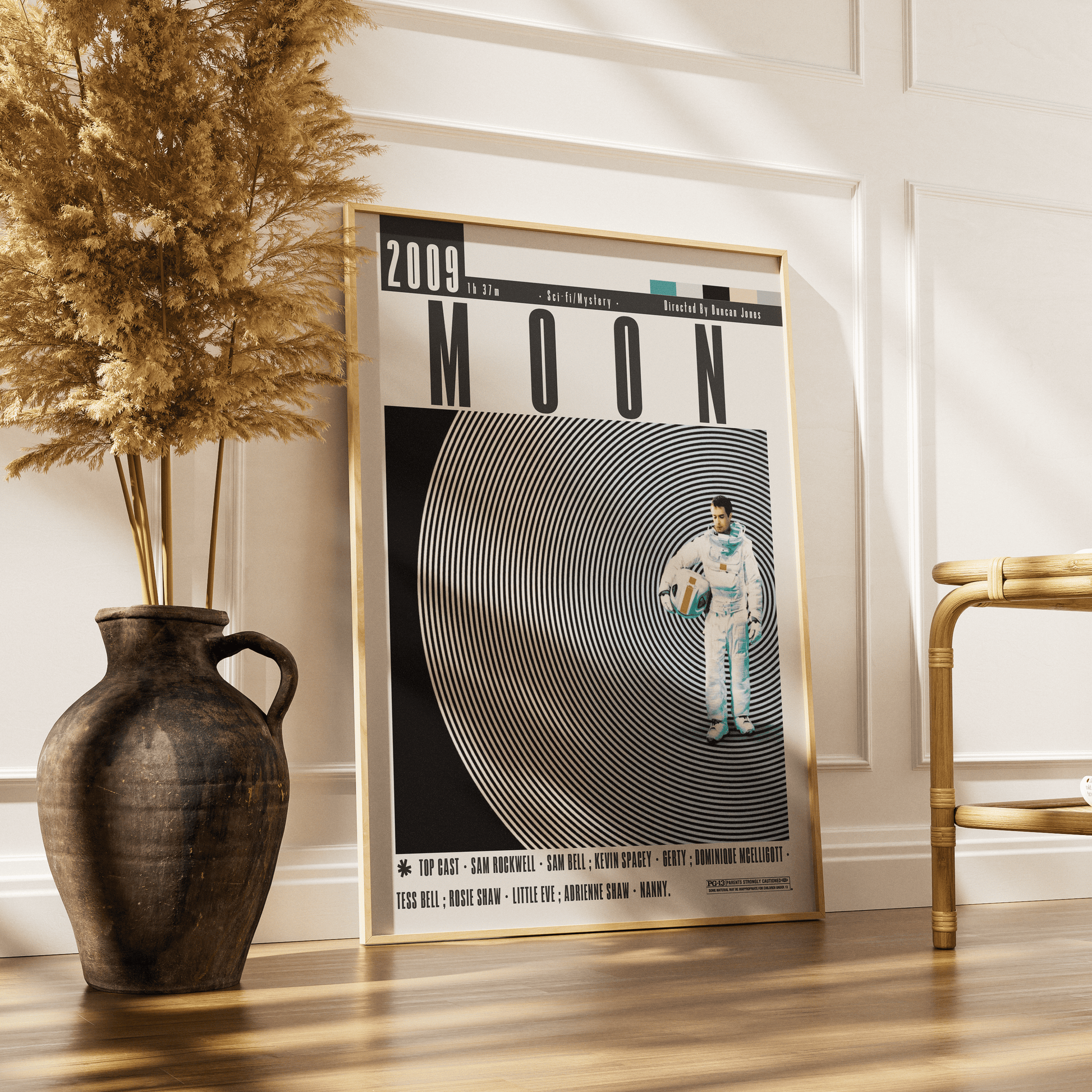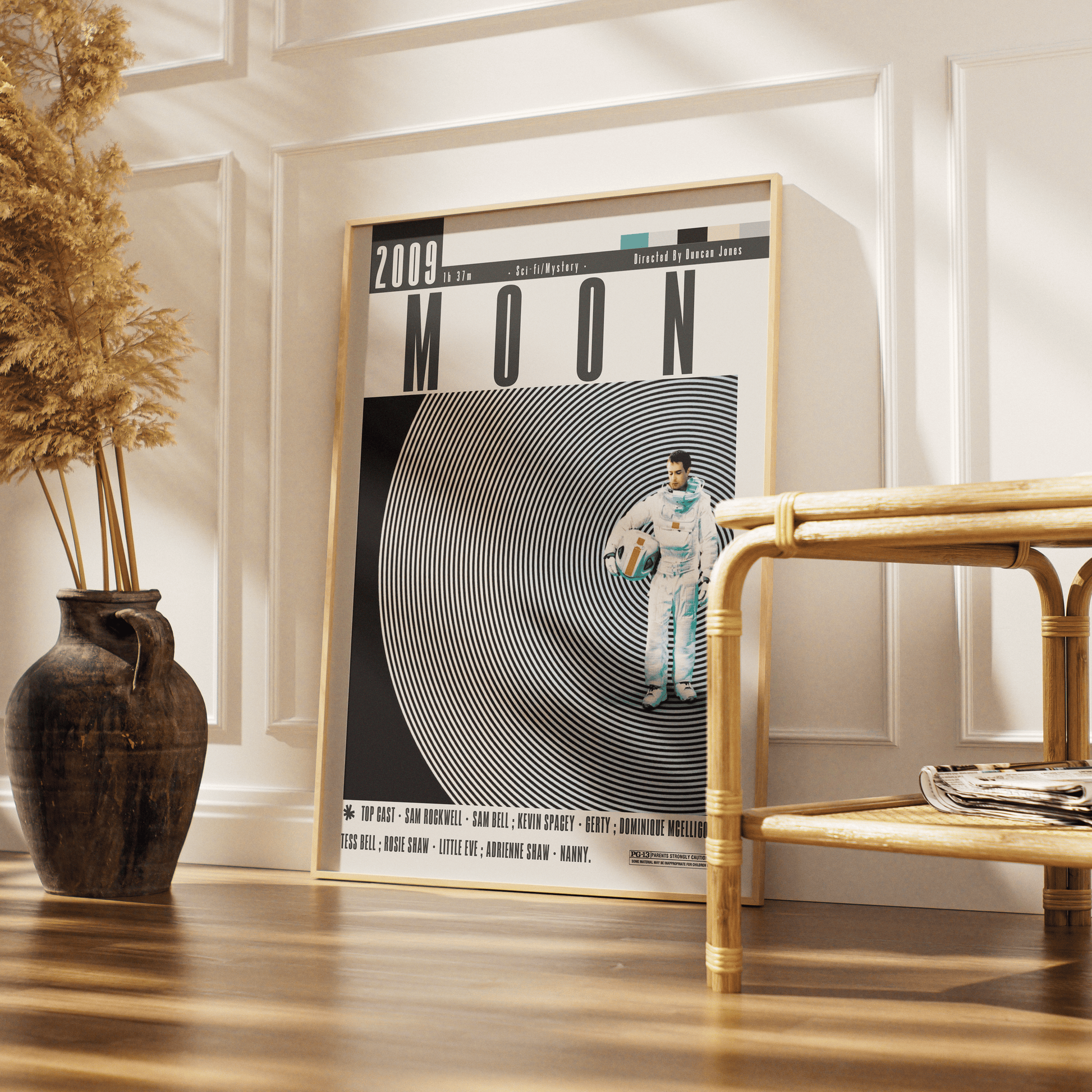 Designed in a classic, vintage, and minimalist style, this print captures the stark serenity of lunar life and the introspective tone that made the film a cult hit. Perfect for fans of Blade Runner, Ex Machina, or thoughtful sci-fi cinema, this Moon art print adds depth, mystery, and sophistication to any modern interior or creative space.