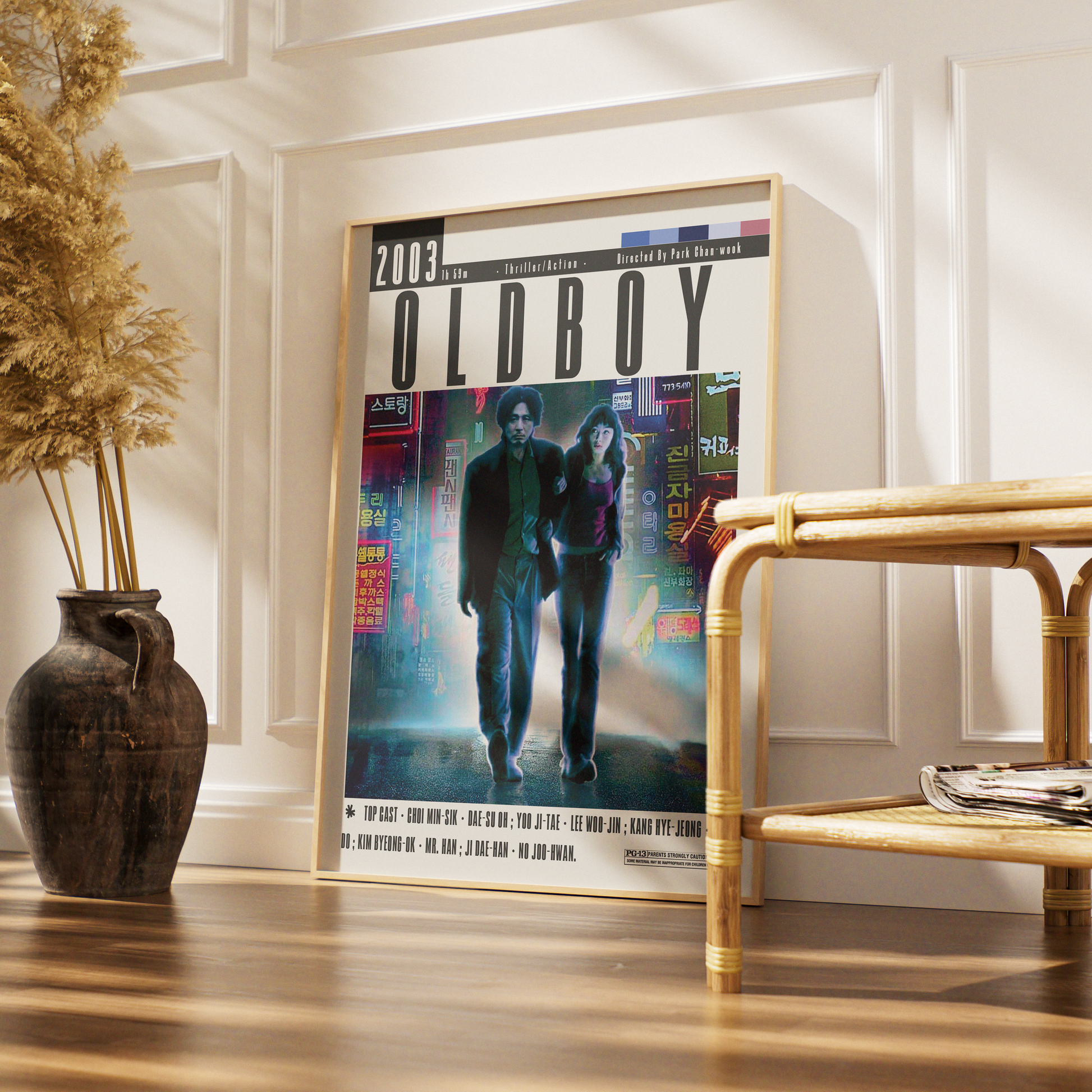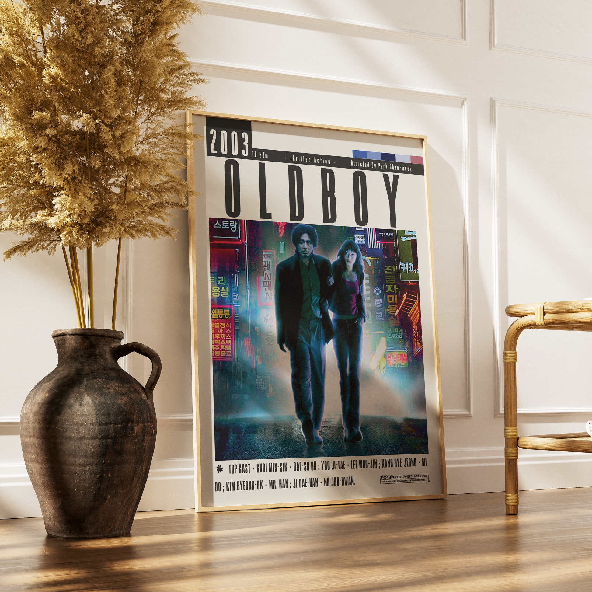 Immerse yourself in the twisted brilliance of Oldboy (2003) with this minimalist art print by 98types Studio. Inspired by Park Chan-wook’s neo-noir masterpiece, this design reflects the film’s psychological depth, haunting symmetry, and iconic visual tension — a cinematic landmark of South Korean cinema.