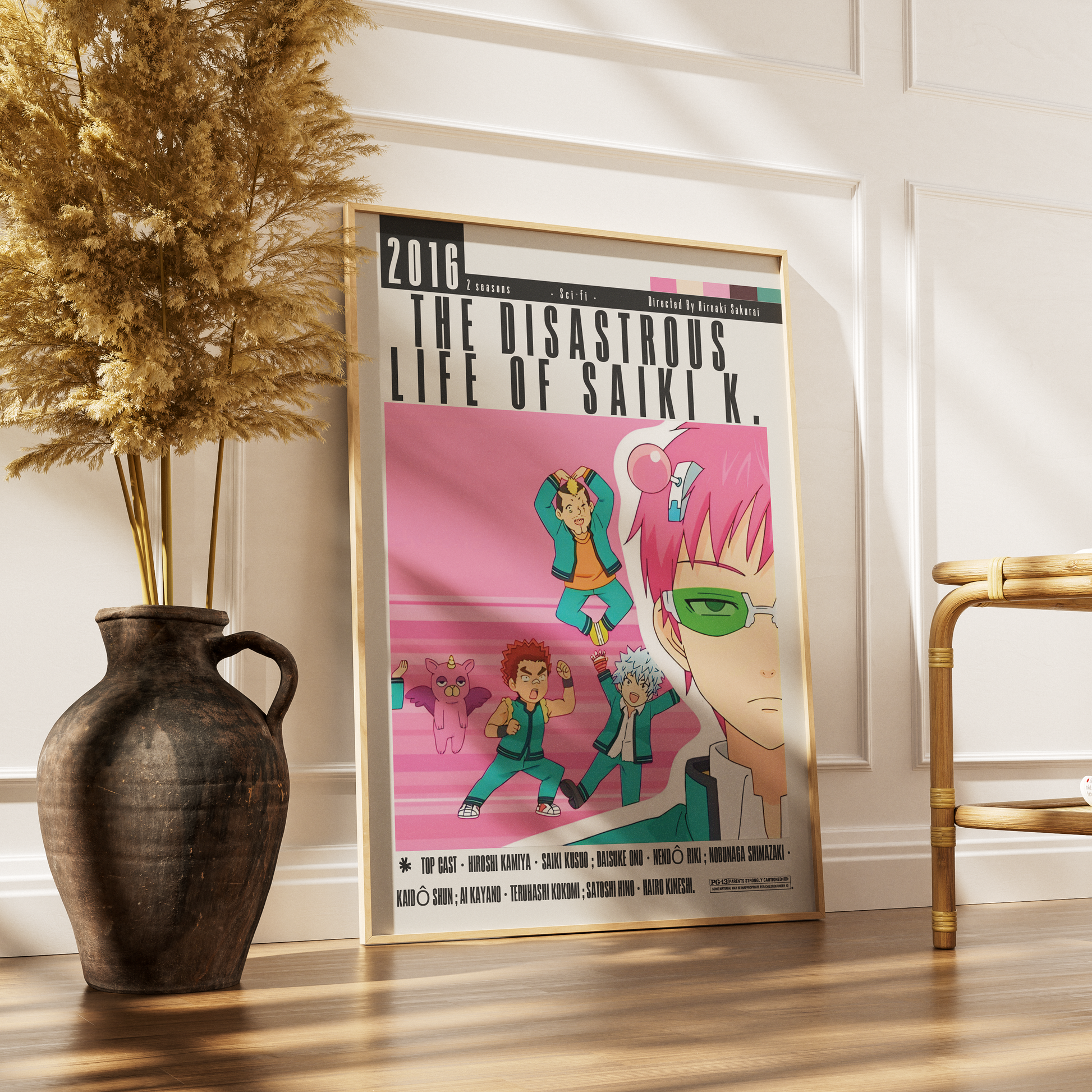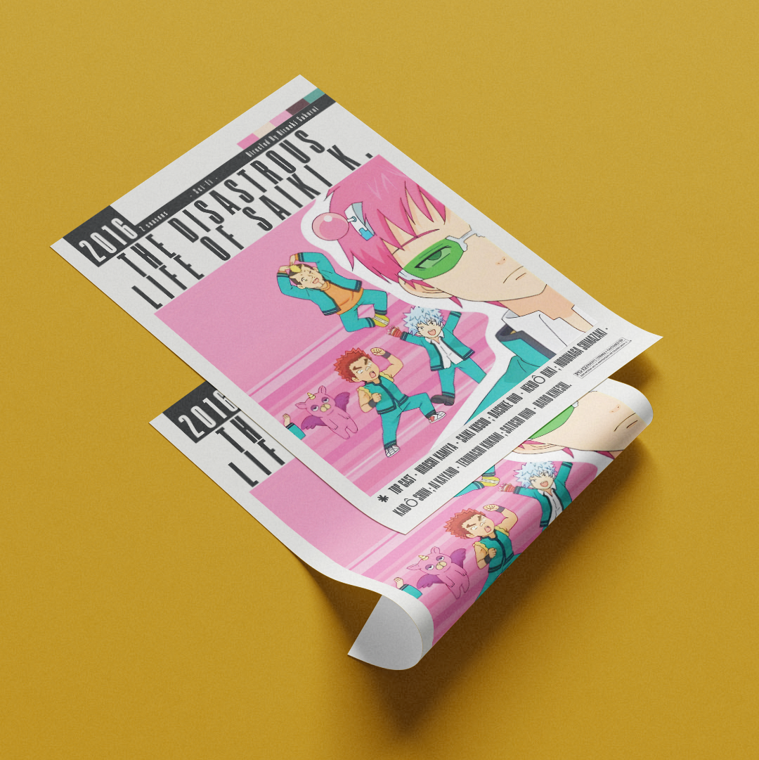 Celebrate the chaotic humour of The Disastrous Life of Saiki K. (2016) with this vibrant poster by 98types Studio. Featuring Kusuo Saiki and his iconic pink hair, antennas and deadpan expression, this artwork captures the anime’s fast-paced comedy, quirky characters, and psychic-powered madness.