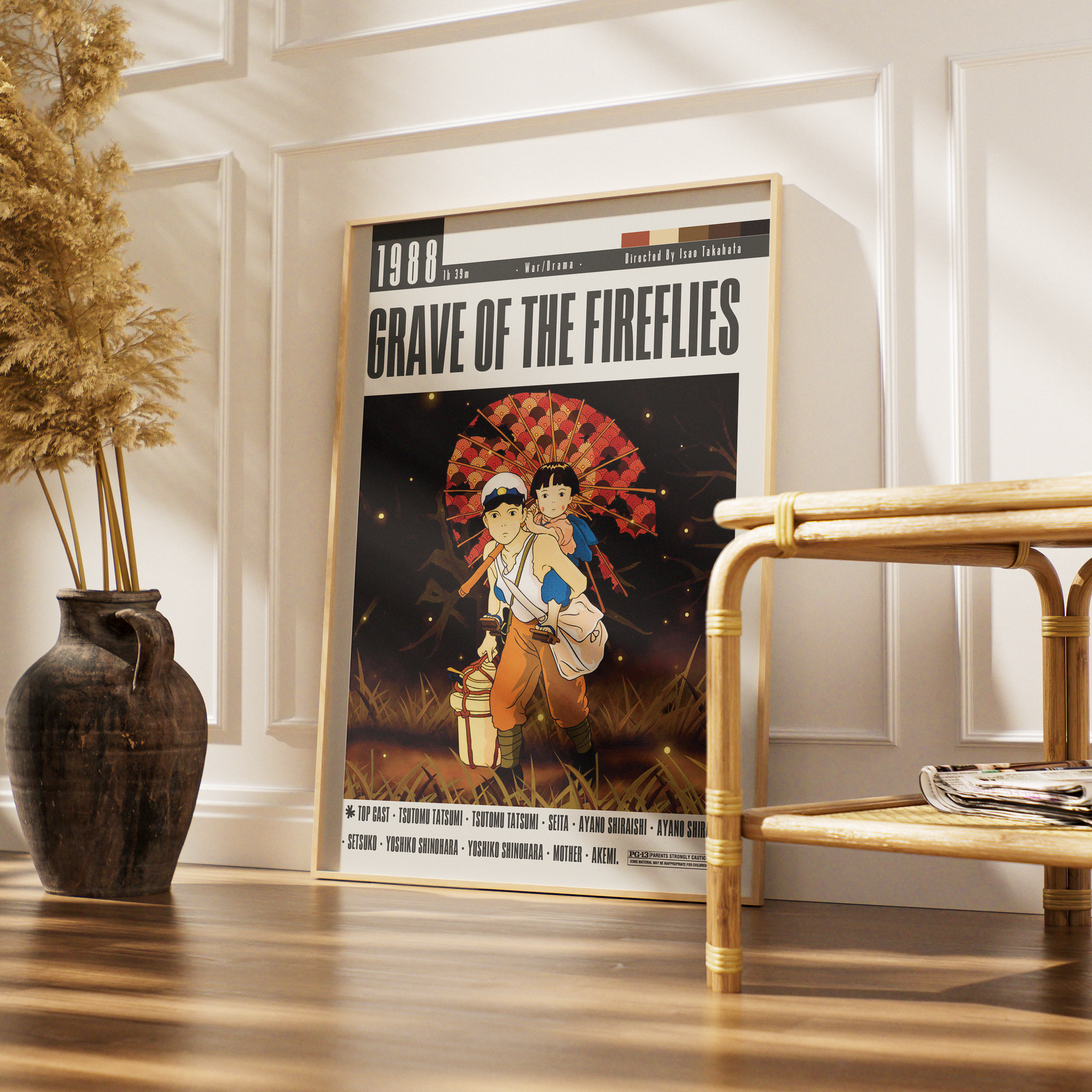 Experience the heartbreaking beauty of Grave of the Fireflies (1988) with this minimalist anime poster by 98types Studio. Inspired by Studio Ghibli’s timeless masterpiece, this UK-made print captures the poignant story of survival, love, and loss during wartime in a delicate, modern design.